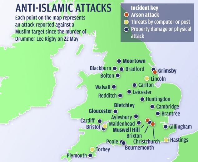 Chaque point de la carte représente une attaque contre une cible musulmane depuis le meurtre de Lee Rigby le 22 mai. Légende : Points rouges : Incendies volontaires – Points jaunes : Menaces par courriers – Points bleus : Dégradations de biens ou attaques physiques