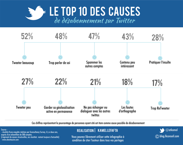 Sur Twitter, on suit -on follow-, on tweete -on écrit un petit bout de texte-, on retweete -on partage un tweet-… mais on se désabonne d’un compte aussi -on unfollow-. Et c’est bien là que réside le mal-être… enfin, sans exagérer, c’est ce que redoute tout compte : perdre en abonnés ! En fouinant sur Twitter, justement, on a déniché une intéressante infographie de Kamel LEFATA (@atkamel), un consultant web, qui décortique le processus de désabonnement et ses causes. Le tweet est donc plus que jamais un art…